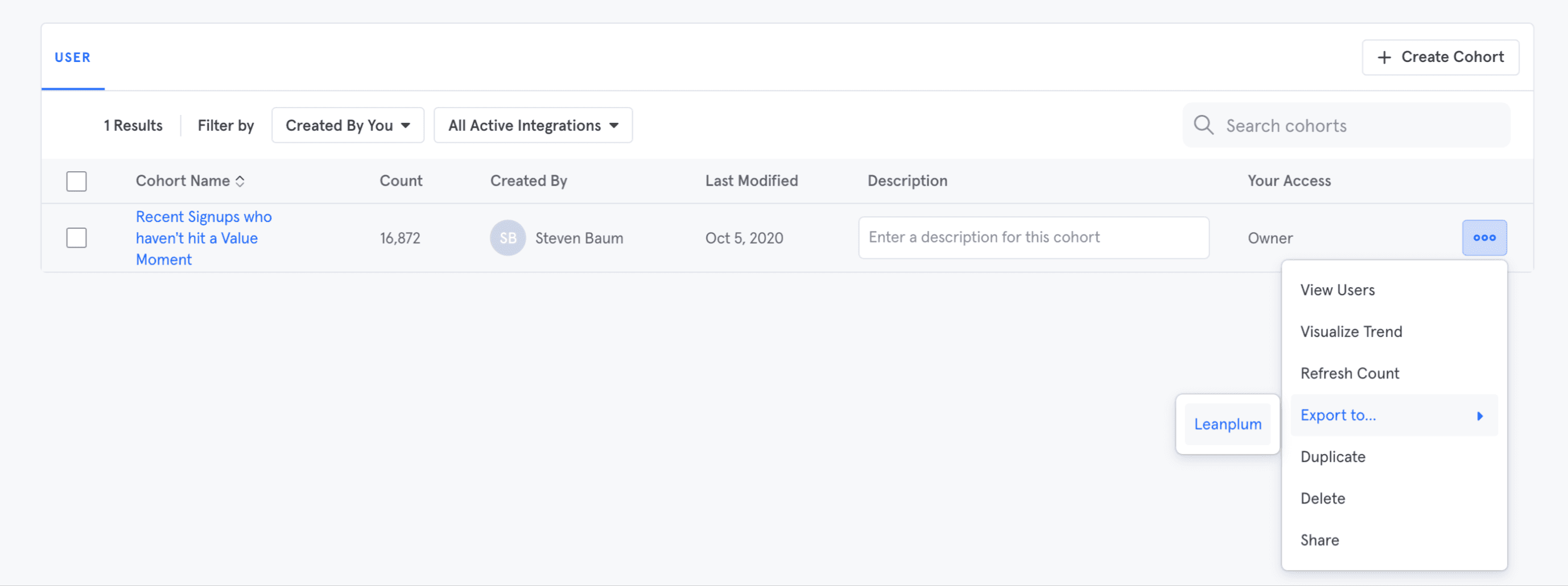 Select the cohort that you want to export. Click on the three-dot icon on the right side of the cohort.